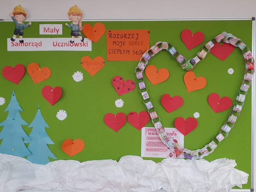 Z okazji Walentynek uczniowie stworzyli kolorowy łańcuch złożony z pozytywnych słów i serdecznych życzeń. Ozdobił on szkolne przestrzenie, przypominając, że warto mówić sobie dobre rzeczy każdego dnia.