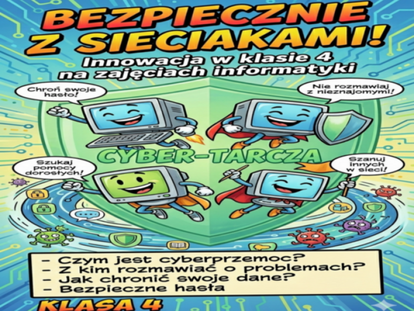 Innowacja pedagogiczna „Bezpiecznie z Sieciakami” realizowana w klasie 4 na zajęciach informatyki w okresie od 01.02.2026 r. do 13.03.2026 r. ma na celu przygotowanie uczniów do świadomego i odpowiedzialnego funkcjonowania w świecie cyfrowym. Jej głównym założeniem jest kształtowanie właściwych postaw związanych z bezpiecznym korzystaniem z Internetu oraz rozwijanie kompetencji cyfrowych, które są niezbędne w codziennym życiu.