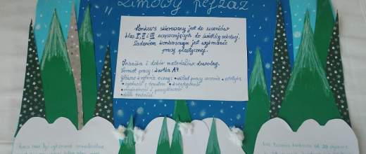 W świetlicy szkolnej odbył się konkurs plastyczny pt. „Zimowy pejzaż”, skierowany do uczniów klas I–III, którzy uczęszczają na zajęcia w świetlicy szkolnej. Celem konkursu było rozwijanie wyobraźni i kreatywności dzieci, doskonalenie umiejętności plastycznych oraz uwrażliwianie na piękno zimowej przyrody. Uczniowie wykazali się dużym zaangażowaniem i pomysłowością, prezentując prace wykonane różnymi technikami plastycznymi. Wszystkie prace cechowały się oryginalnością oraz starannością wykonania. Jury miało trudne zadanie, ponieważ poziom konkursu był bardzo wysoki. Laureaci otrzymali kartki pamiątkowe, podziękowanie i drobne upominki. Konkurs sprawił dzieciom wiele radości i był okazją do twórczego spędzenia czasu.