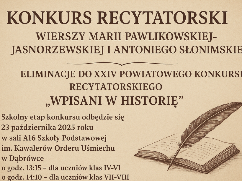 Konkurs ma na celu wyłonienie reprezentantów szkoły do XXIV Powiatowego Konkursu Recytatorskiego „Wpisani w historię”.