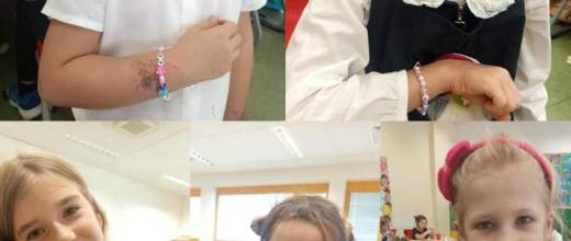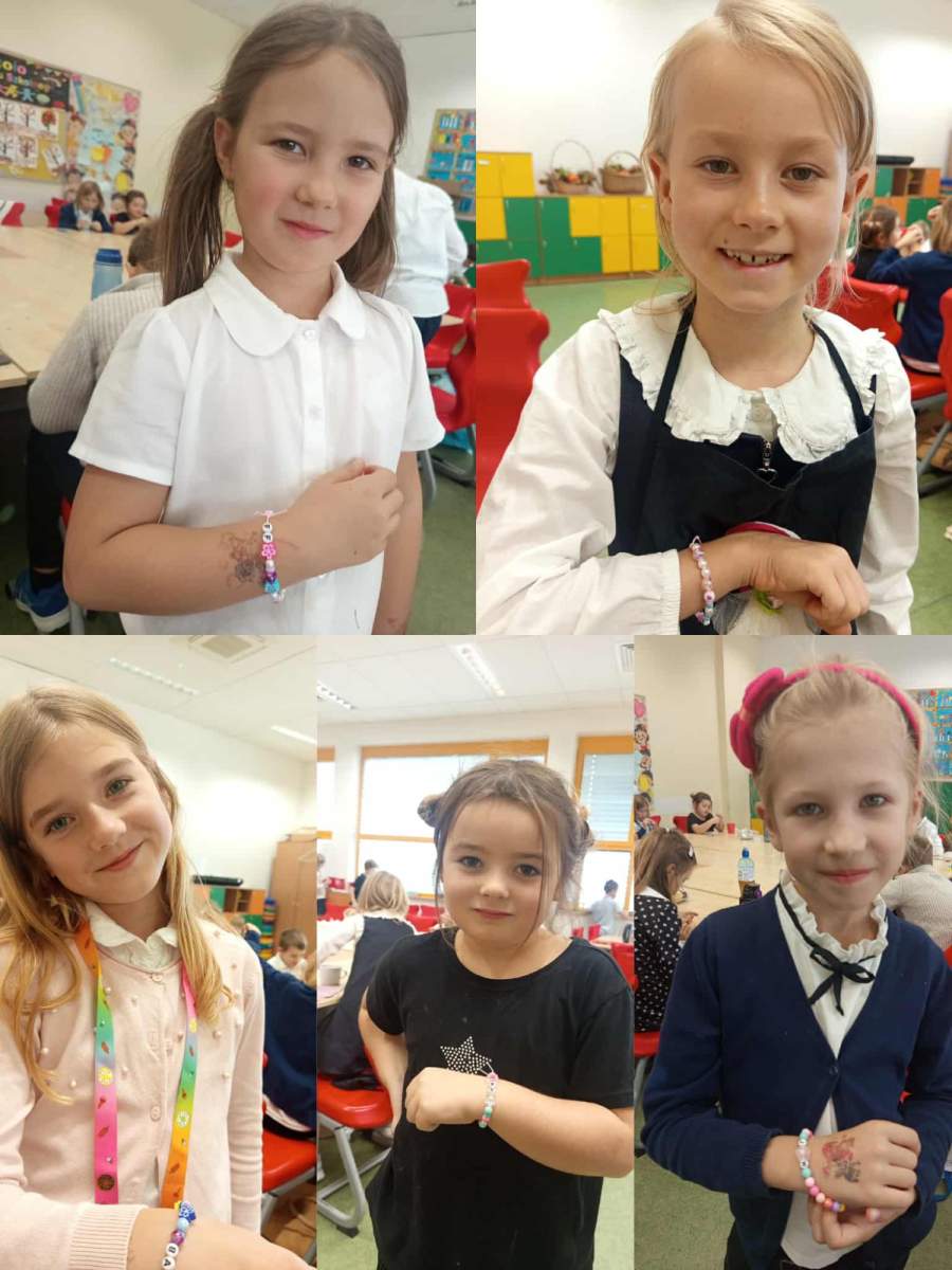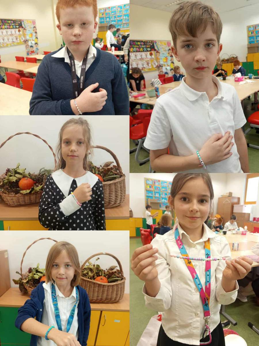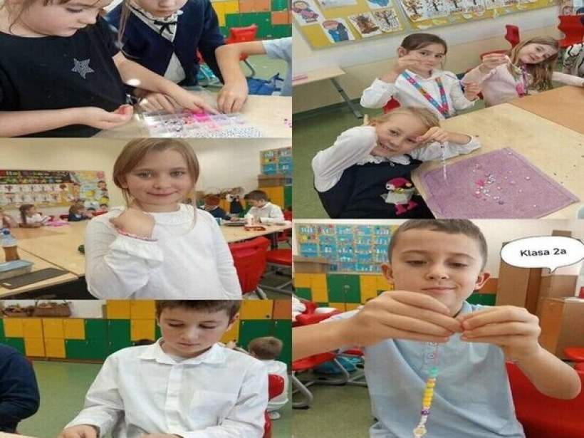 Uczniowie klasy 2A wzięli udział w kreatywnych zajęciach rozwijających motorykę małą. Dzieci z ogromnym zaangażowaniem nawlekały kolorowe koraliki, wiązały supełki i tworzyły bransoletki z własnymi inicjałami, które zostaną z nimi na pamiątkę na długi czas.