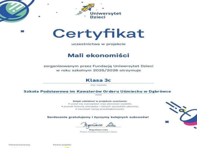 Z radością informujemy, że uczniowie klasy 3c pod opieką Joanny Jurek ukończyli ogólnopolski projekt edukacyjny „Mali ekonomiści”, realizowany w ramach programu Uniwersytet Dzieci w Klasie. Przez kolejne tygodnie dzieci odkrywały świat ekonomii w sposób ciekawy, angażujący i bliski codziennym doświadczeniom, łącząc naukę z zabawą oraz praktycznym działaniem.