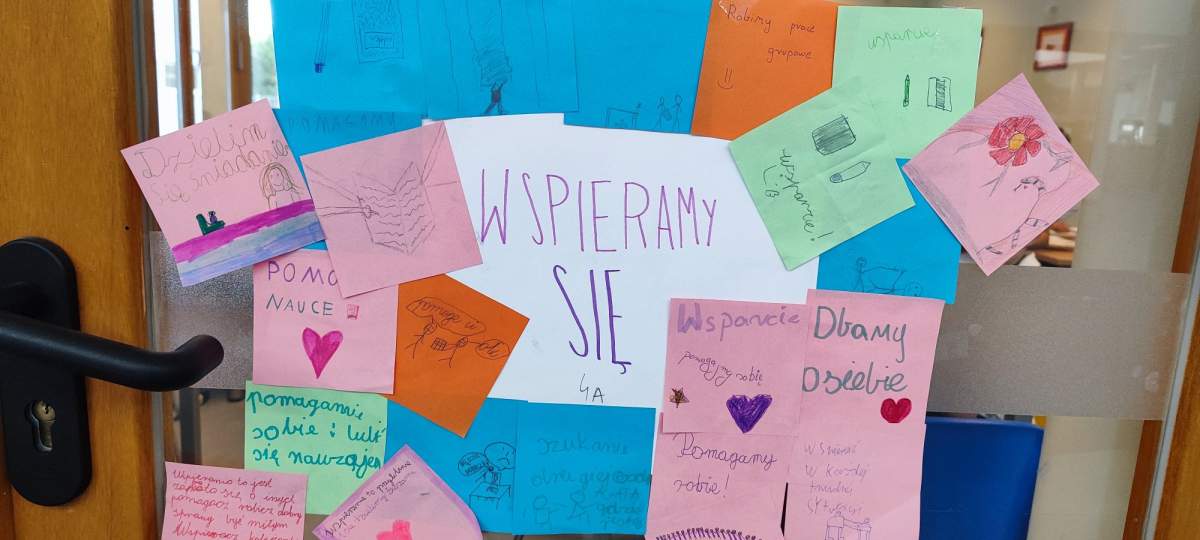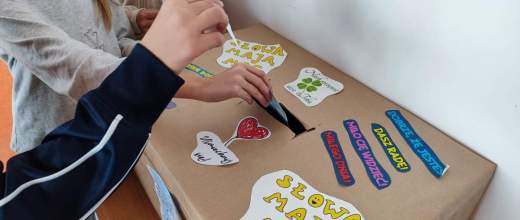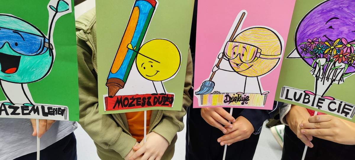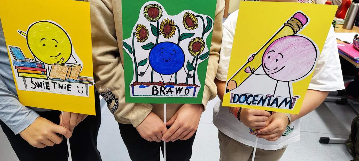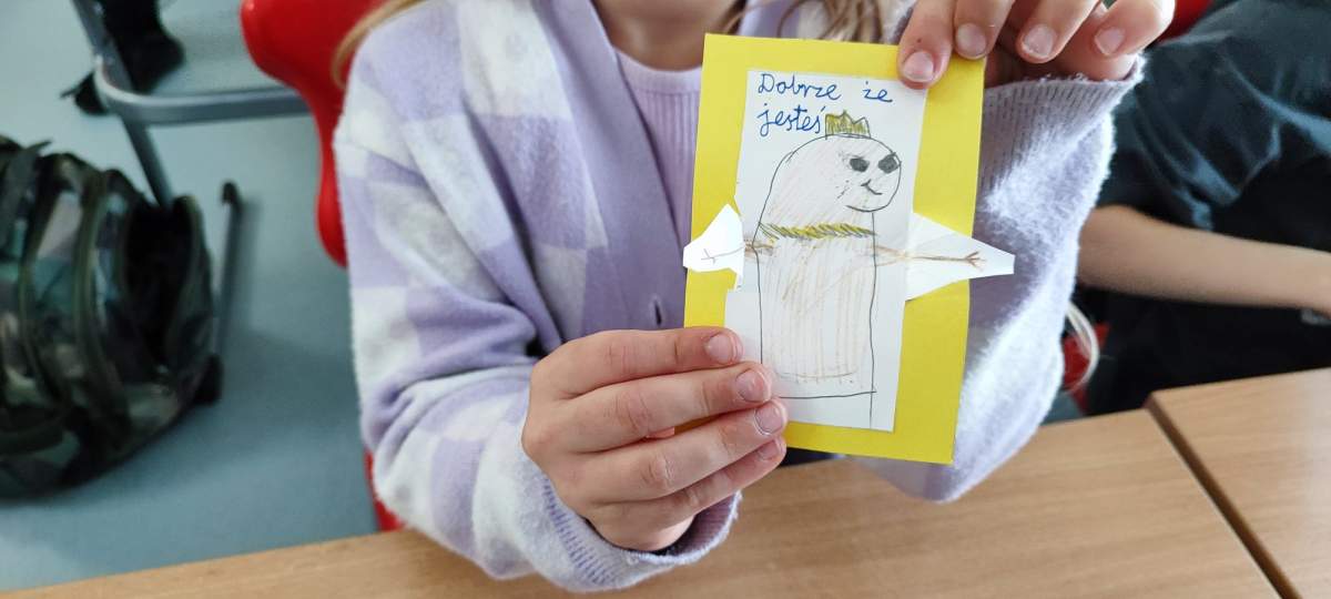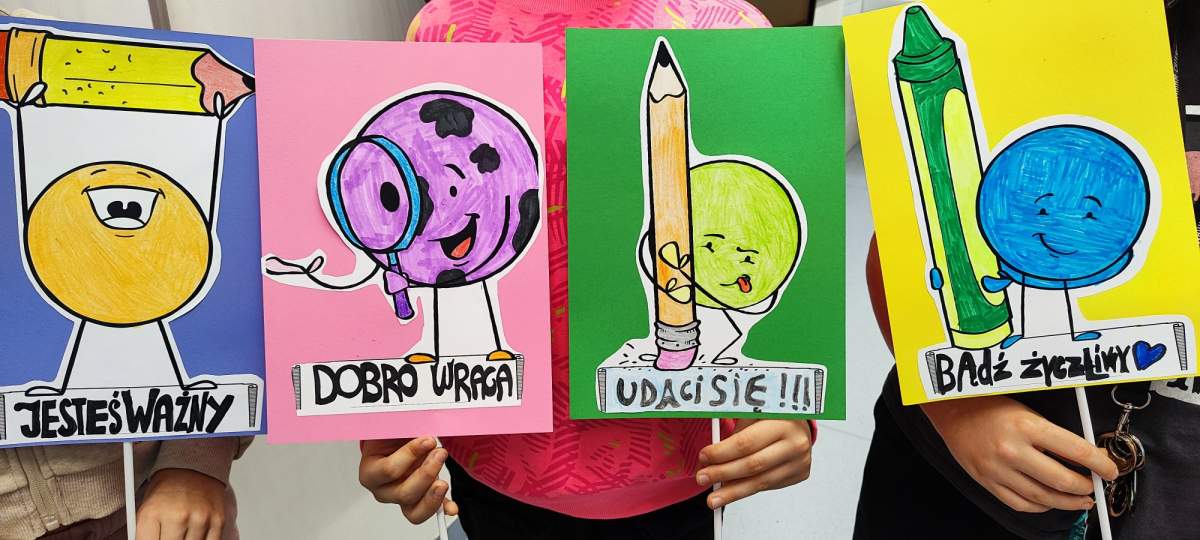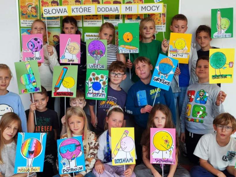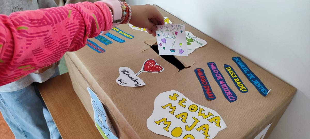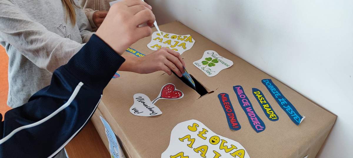 Podczas zajęć uczniowie zastanawiali się, jakie słowa chcieliby słyszeć częściej – te, które dodają siły, budują, motywują i sprawiają, że na twarzy pojawia się uśmiech. Wszystkie te dobre słowa trafiły do specjalnego kartonu mocy – symbolicznego miejsca pełnego pozytywnej energii.