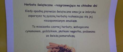 W miniony piątek obchodziliśmy w naszej szkole święto herbaty. Z inicjatywy Samorządu Uczniowskiego wszyscy uczniowie mieli możliwość degustacji kilku gatunków herbaty i poznania ich zdrowotnych właściwości. Wśród nich znalazła się herbata świąteczna wzbogacona aromatem goździków i cynamonu podawana ze świeżą pomarańczą. Dużą popularnością cieszyła się również herbata ziołowa z czystka podawana z miodem. Uczniowie nie mogli oprzeć się herbacie miętowej parzonej ze świeżej mięty z cukru trzcinowego. Mamy nadzieję, że herbata rozgrzała wszystkich w ten mroźny dzień oraz dodała energii na koniec pierwszego półrocza.