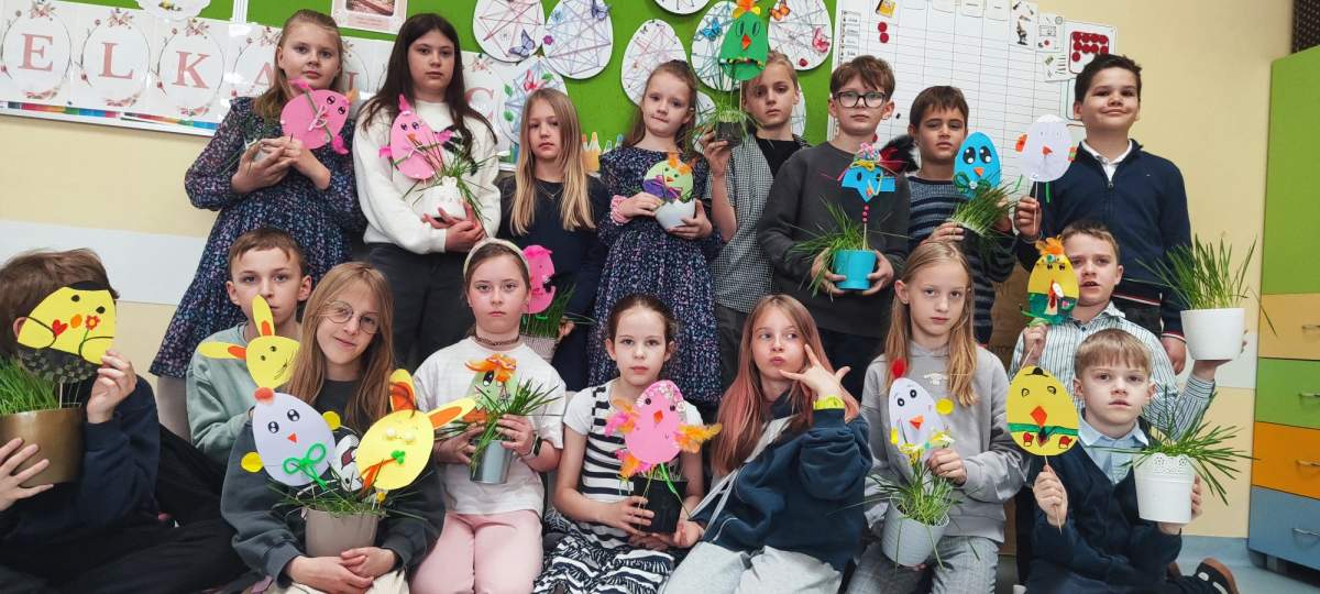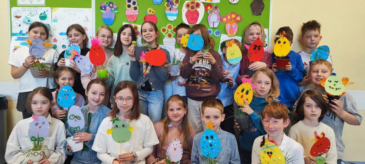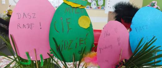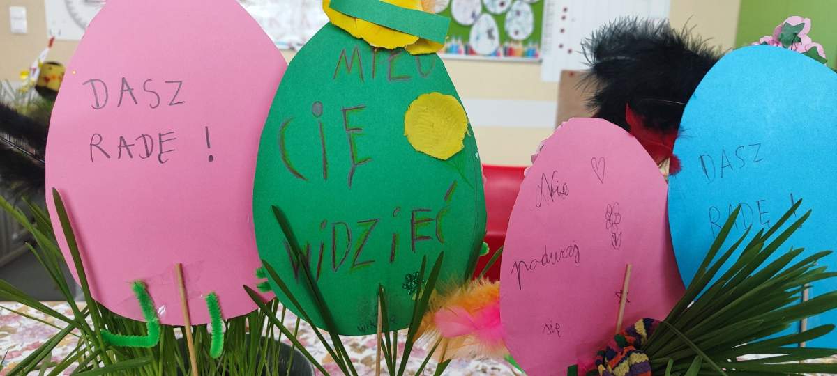 W świątecznym klimacie uczniowie przygotowali papierowe jajka, na których umieścili miłe słowa i krótkie, pozytywne przesłania. Następnie zostały one wyeksponowane